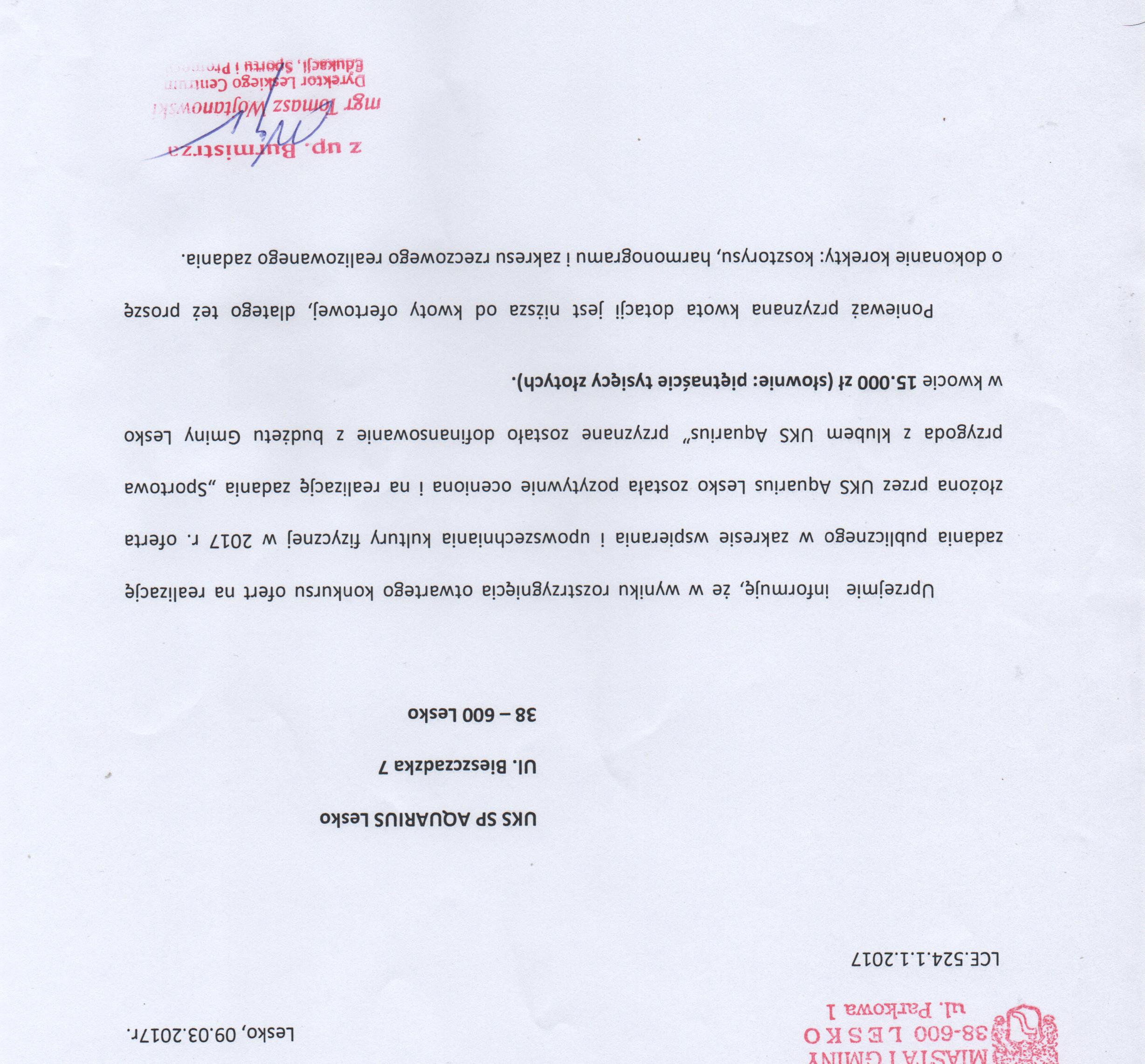 Sportowa przygoda z klubem UKS Aquarius Lesko, to działanie realizowane przy współpracy z gmina Lesko. Fundusze na ten cel zostały zabezpieczone w 70% z budżetu gminy Lesko ,pozostała cześć to wkład własny klubu UKS AQUARIUS. Zadanie obejmuje miedzy innymi : zakup sprzętu pływackiego ( płetwy, mono płetwy, wiosełka pływackie) , w zadaniu również zawarta jest organizacja zawodów pływackich . Fundusze pozyskane w ramach projektu posłużą również do udziału w zawodach zewnętrzny i obejmują koszty związane z wyżywieniem czy transportem. Całkowita wartosc projektu to 20 050 zł z tego 15.000 zł dofinansowania z środków gminy Lesko