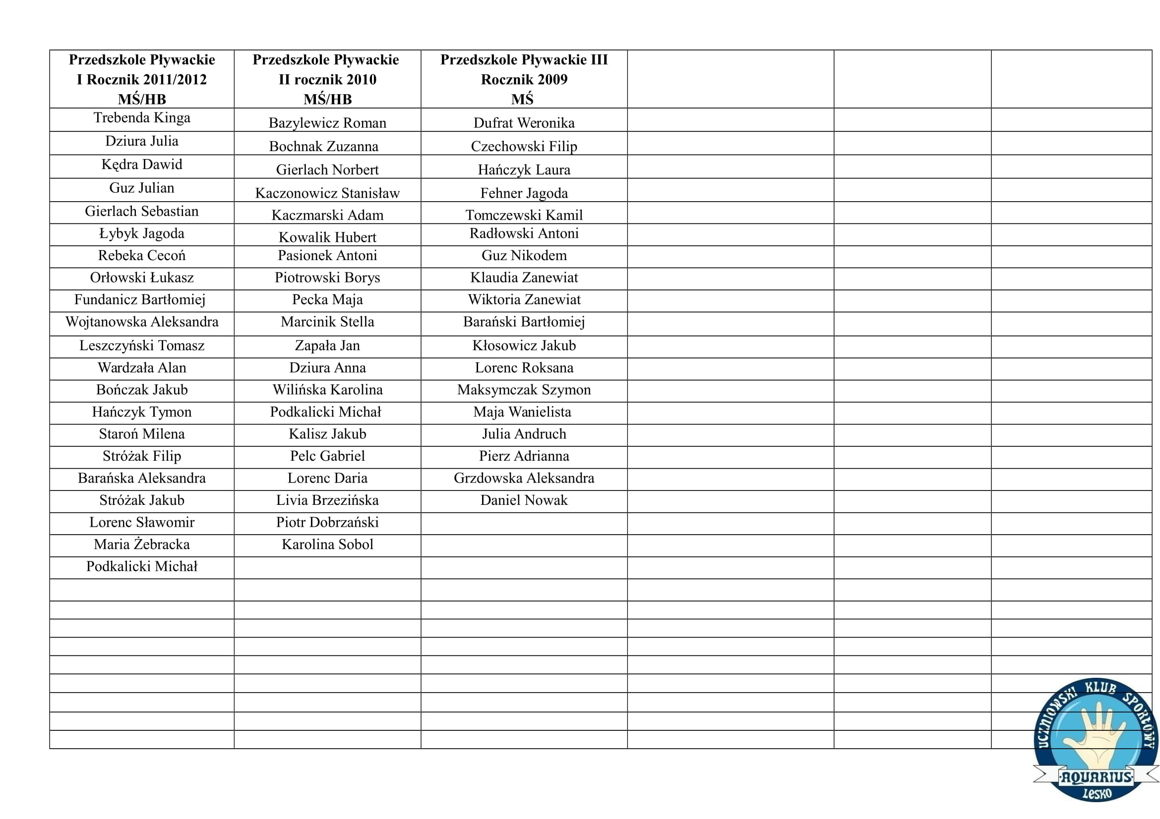 Listy i podział na Grupy Pływackie:)