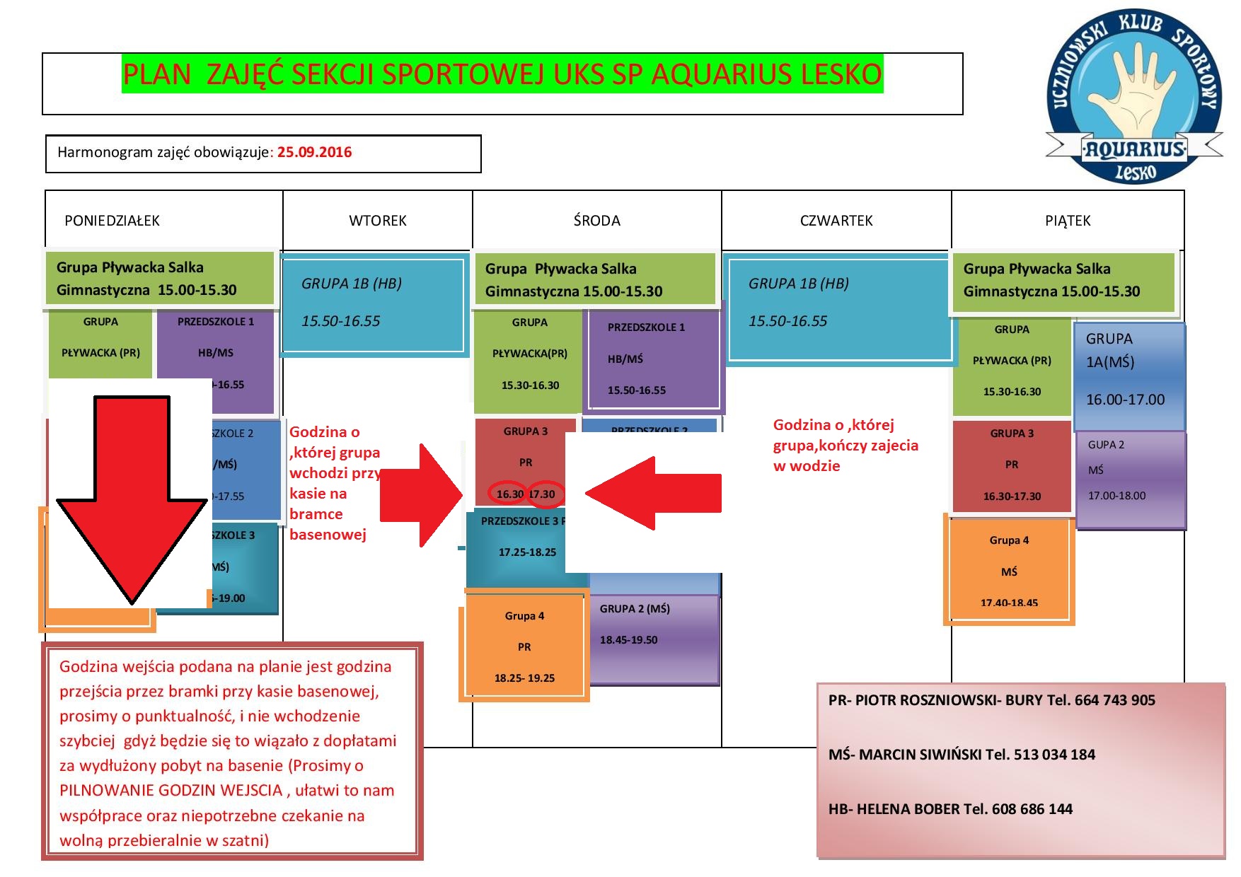 Drodzy Państwo. Jesteśmy po pierwszym tygodniu zajęć, Listy członków zostały dopracowane jak również plan pracy UKS , Prosimy o stosowanie się do zaleceń zawartych w planie ułatwi nam to pracę oraz wydłuży czas trwania zajęć w wodzie i oszczędzi niepotrzebnego czekania na trybunie basenowej. Prosimy również o terminowe wpłacanie składki członkowskiej w wysokości 80 zł miesięcznie Pozdrawiamy Ekipa UKS AQUARIUS :)