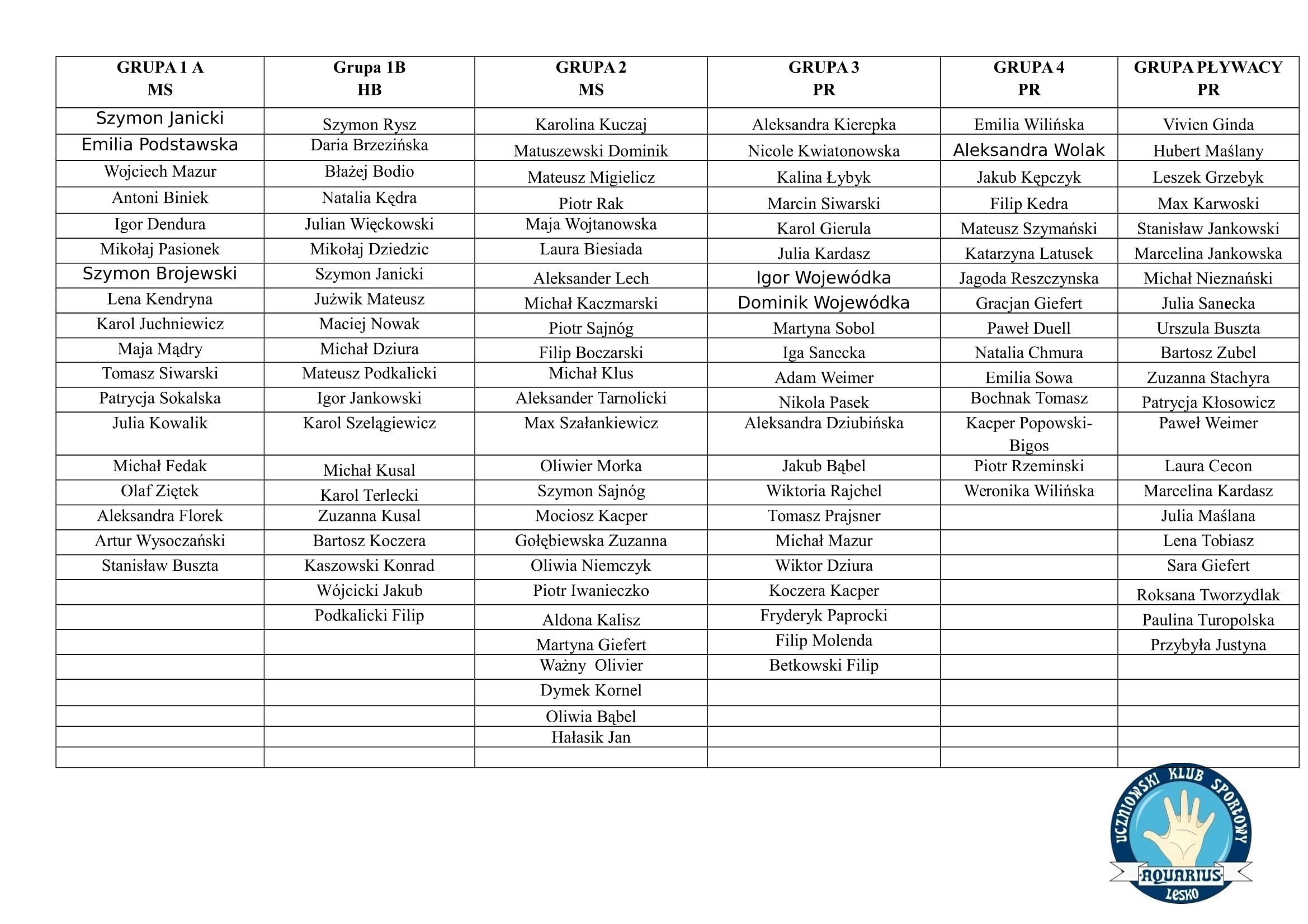 Listy i podział na Grupy Pływackie:)