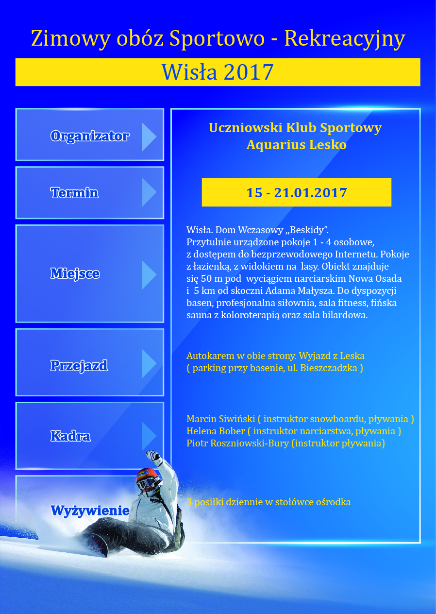 Drodzy Rodzice i KLUBOWICZE :) Przygotowaliśmy dla państwa wcześnie zapowiadana ofertę klubowego obozu zimowego, który odbędzie się w tym roku w Wiśle :). W ofercie tegorocznej proponujemy ośrodek który znajduje się zaraz przy stoku narciarskim , mający w swoim wyposażeniu atrakcje takie jak basen, siłownie ,sale fitness. Ponadto w planach obozu jest przewidziane wyjście do Aquaparku Gołębiewski Więcej informacji na plakatach lub u trenera Marcina Siwińskiego:)